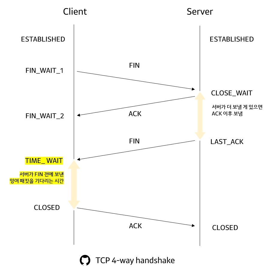 TCP 4-way Handshake에서 클라이언트는 서버의 잉여 패킷을 기다리는 TIME_WAIT을 가진다.