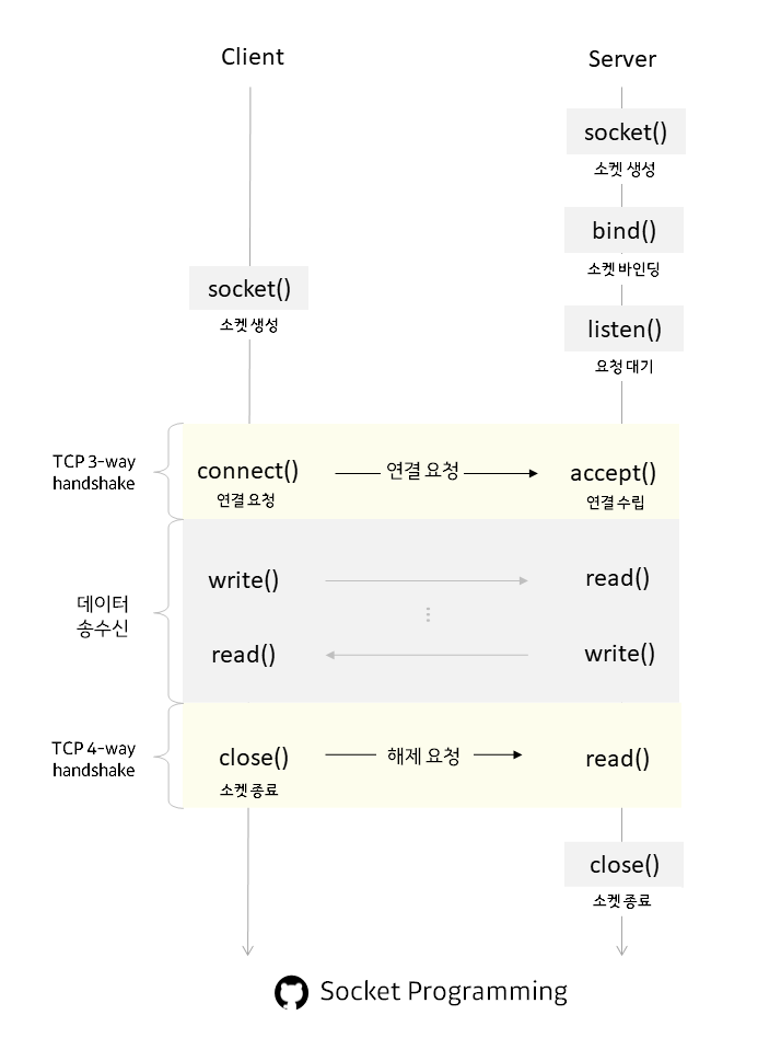 네트워크로 연결된 두 컴퓨터 사이에서 데이터를 주고 받는 방식을 의미한다. 클라이언트와 서버간의 1:1 양방향 통신을 한다.소켓 프로그래밍을 구현하는 데에는 TCP와 UDP 두가지 프로토콜이 있지만, 여기서는 주로 사용하는 TCP만 살펴보았다. UDP와의 가장 큰 차이는 연결 지향 프로토콜이라는 점이다. (TCP의 연결/해제 방식은 이전 장에서 살펴보았다) 클라이언트와 서버가 소켓 프로그래밍으로 연결되어 데이터를 송수신하는 과정은 다음과 같다. (여기서 클라이언트/서버는 고정된 게 아니라, 데이터를 주고/받는 쪽을 의미한다)