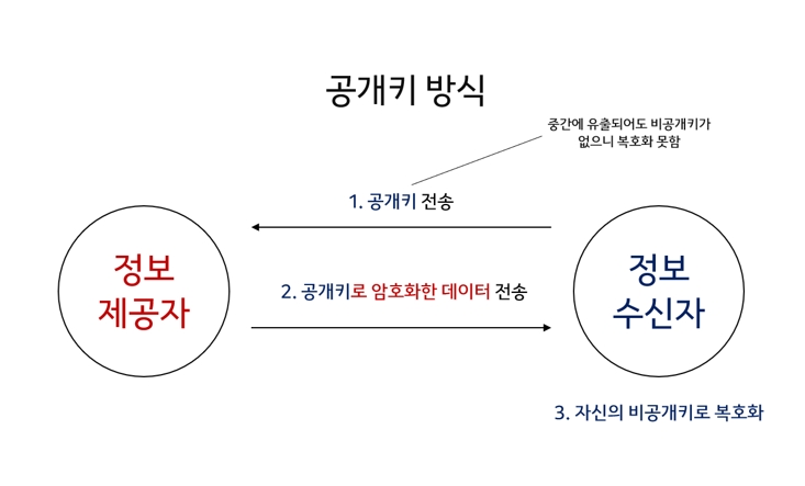 공개키를 받은 정보제공자는 공개키를 이용해서 정보를 암호화하여 비공개키를 가지고 있는 사람에게 전송한다.