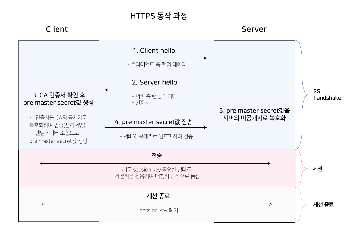 서버와 클라이언트는 pre master secret 값을 공유하고, 이 값을 master secret 값으로 만든다.