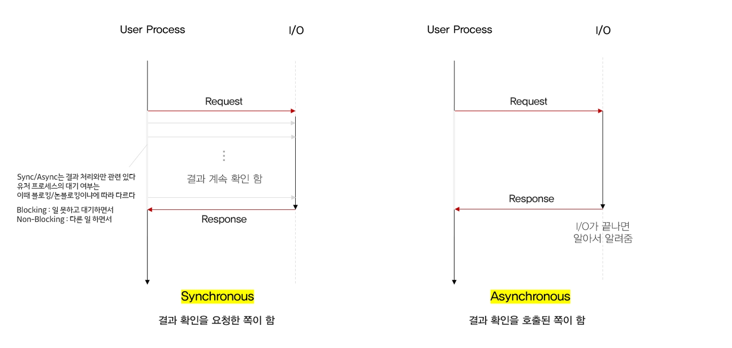 Synchronous : ์ ์ ํ๋ก์ธ์ค๊ฐ I/O ๊ฒฐ๊ณผ๋ฅผ ๊ณ์ ๊ธฐ๋ค๋ฆฐ๋ค. ๊ณ์ํด์ I/O ์์ ์ด ์๋ฃ๋์๋ ์ง ํ์ธํ๋ค.