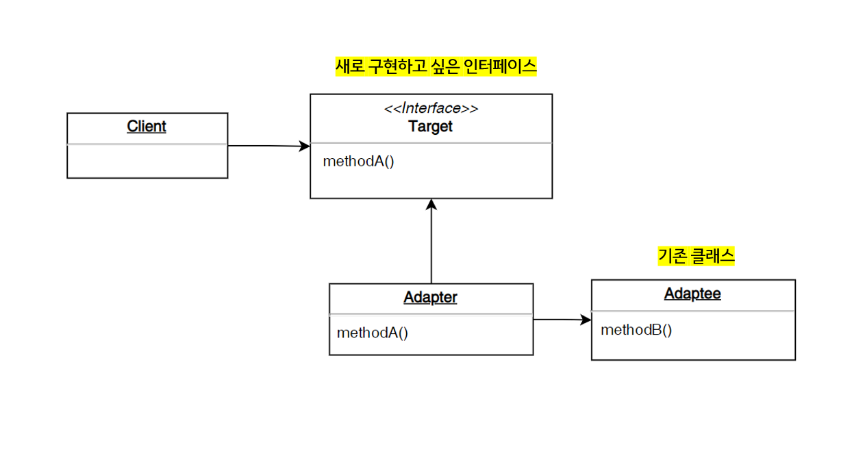 기존 클래스(Adaptee)가 새로운 인터페이스(Target)를 구현하고 싶은 상황